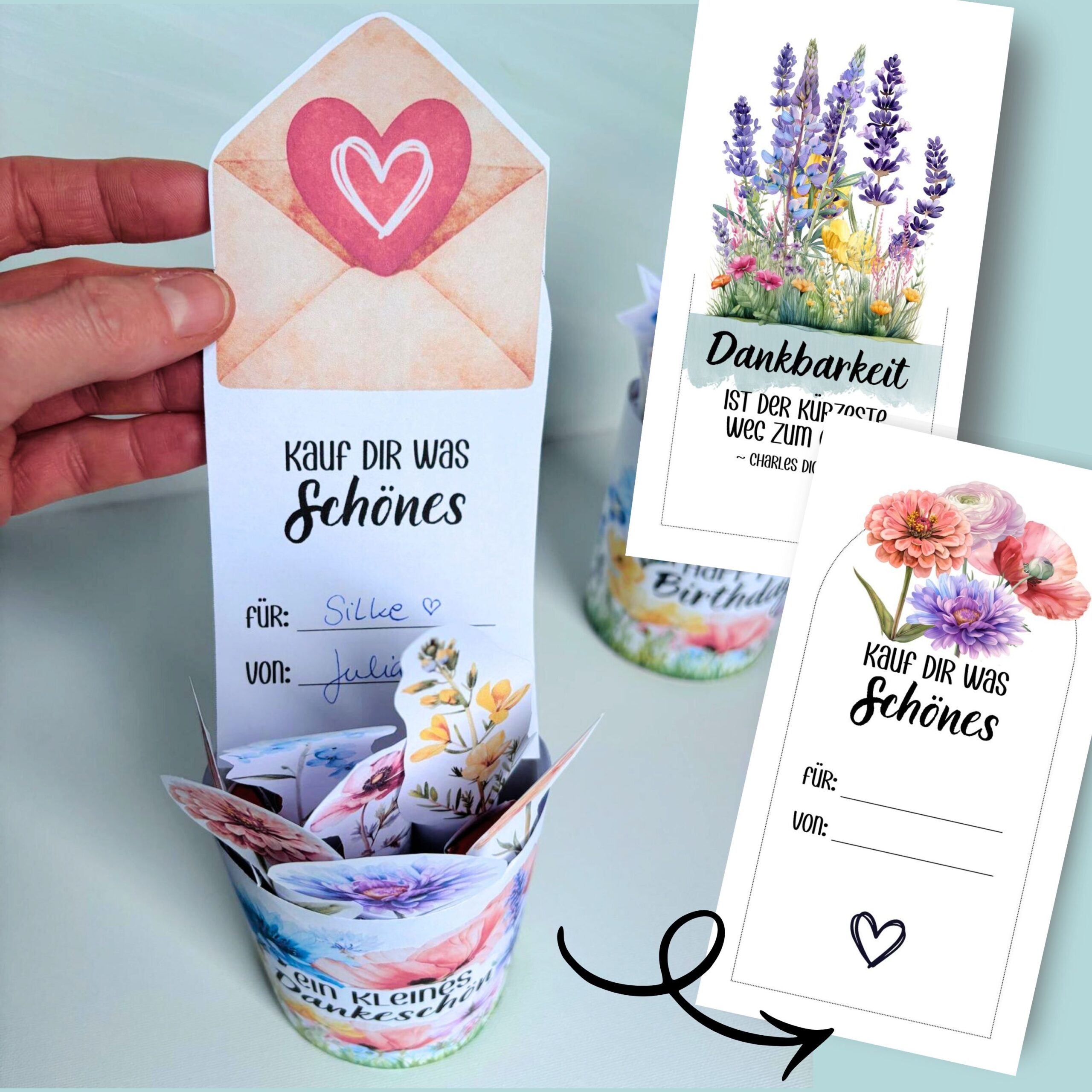 Als Highlight habe ich 3 verschiedene Innenetiketten entworfen, um z.b. Gutscheine oder Geld zu verpacken und zu verschenken.