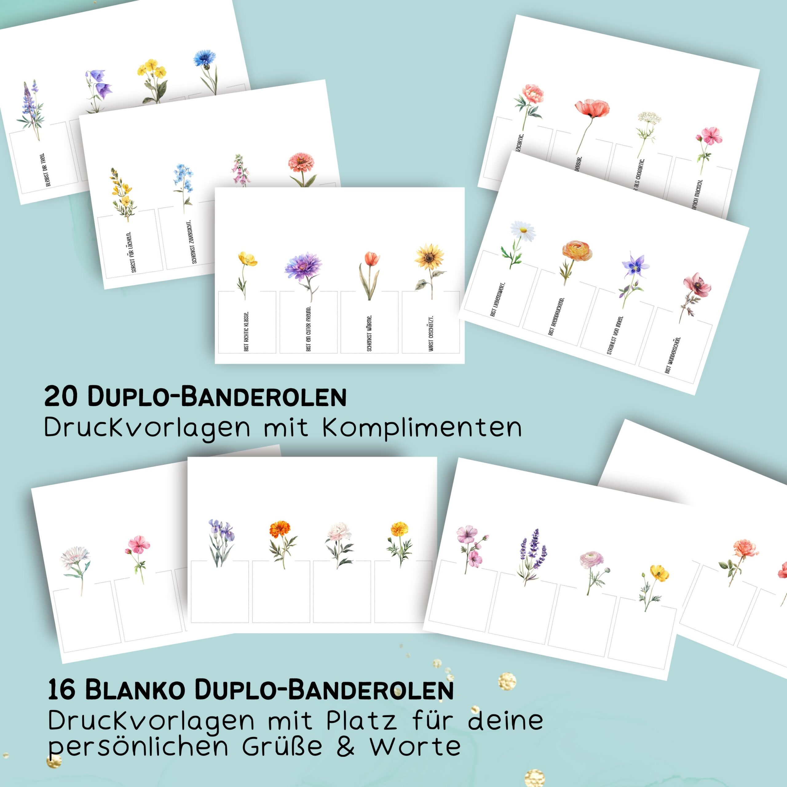 20 Liebevolle Botschaften & Komplimente schmücken die Banderolen, die um Schokoriegel z.b. Duplo gewickelt werden. Zusätzlich erhältst du noch 16 weitere Blanko-Banderolen mit Blumen, die genug Platz beinhalten für deine persönlichen Worte & Sprüche.