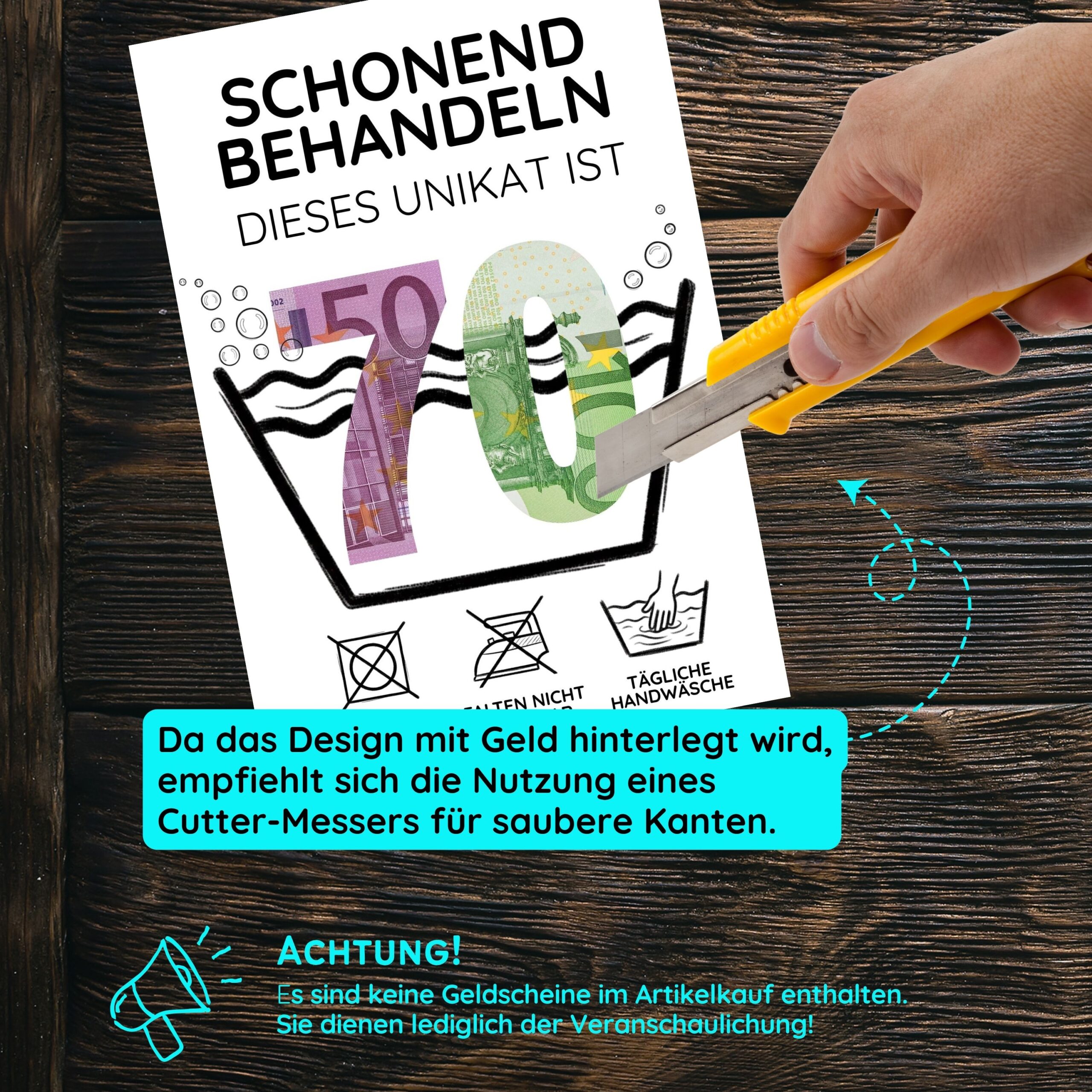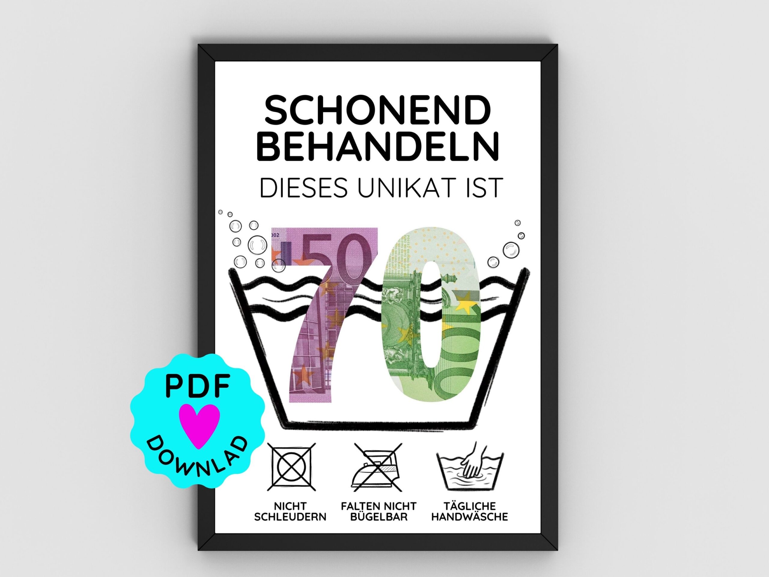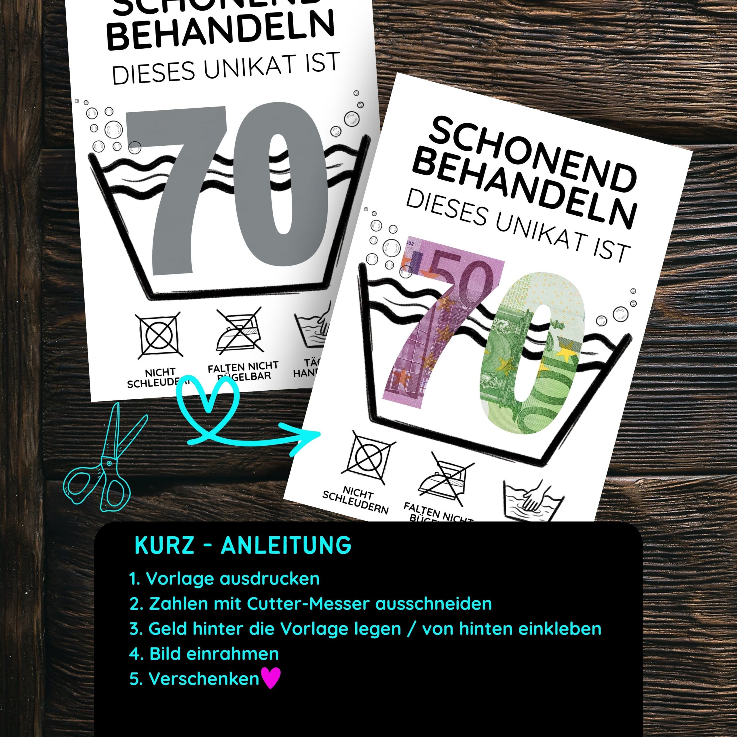 Die Druckvorlage „Schonend behandeln – das Unikat ist 70!“ ist das perfekte Last-Minute Geschenk & originelle Art Geld zu verschenken.