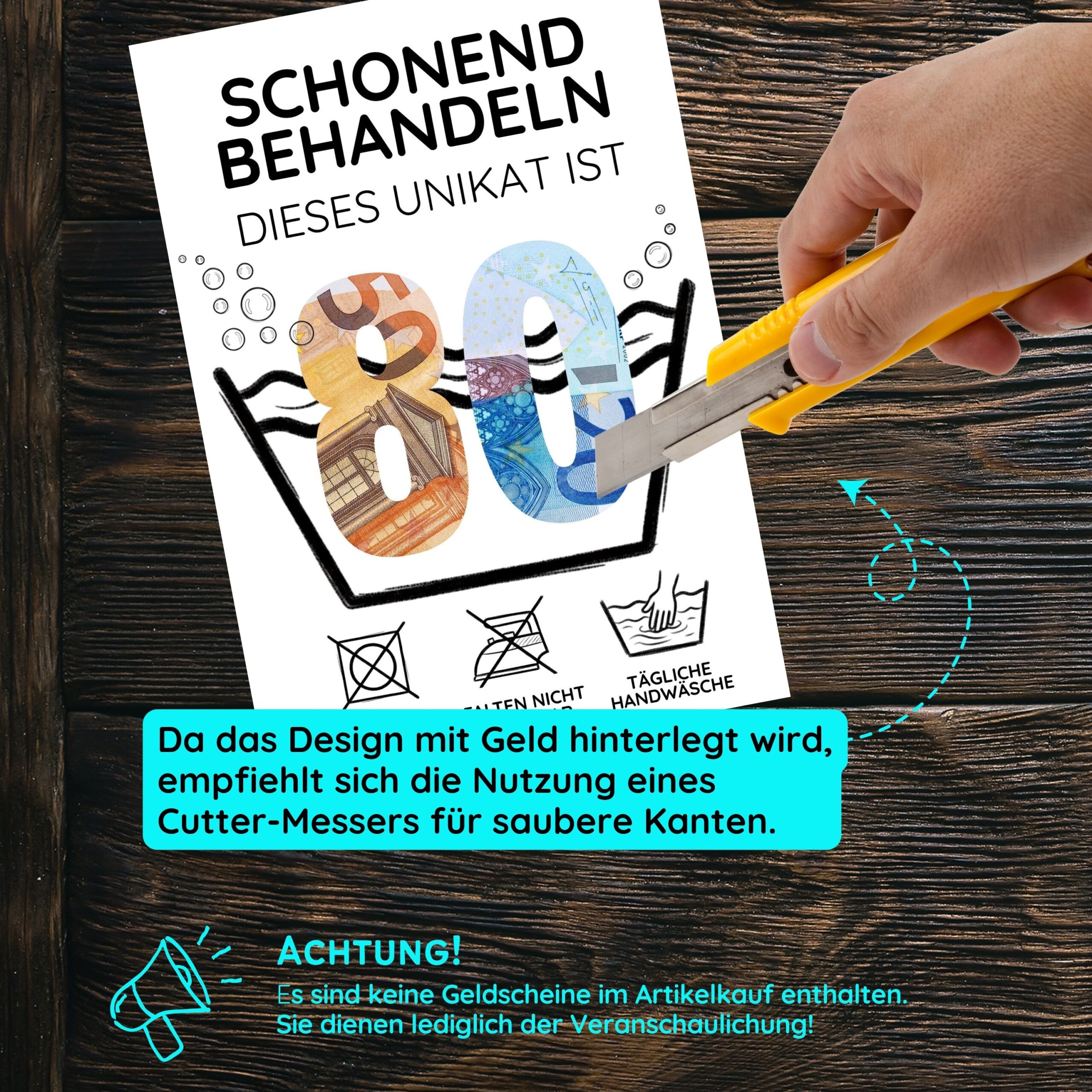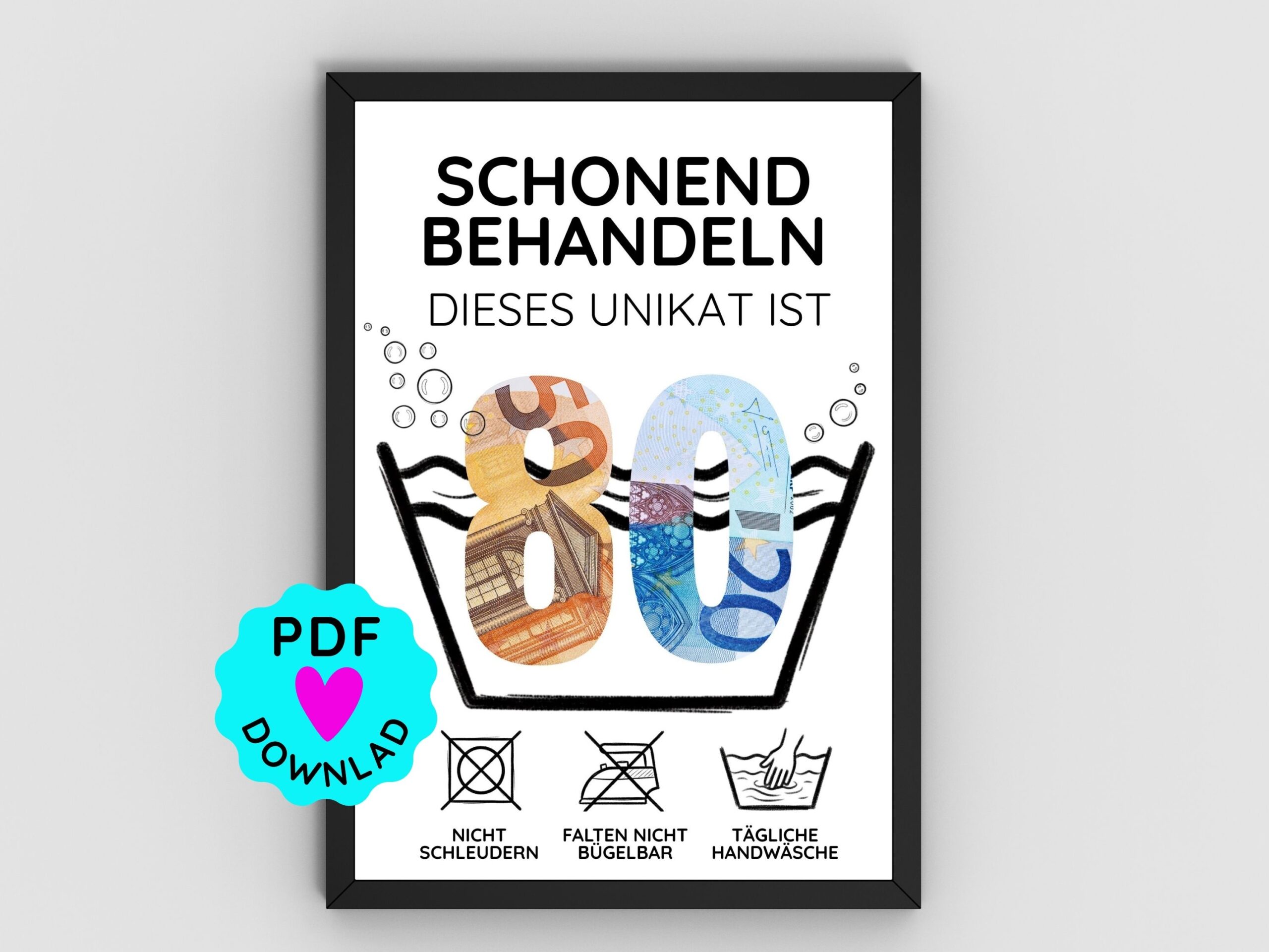 Die Druckvorlage „Schonend behandeln – das Unikat ist 80!“ ist das perfekte Last-Minute Geschenk & originelle Art Geld zu verschenken.