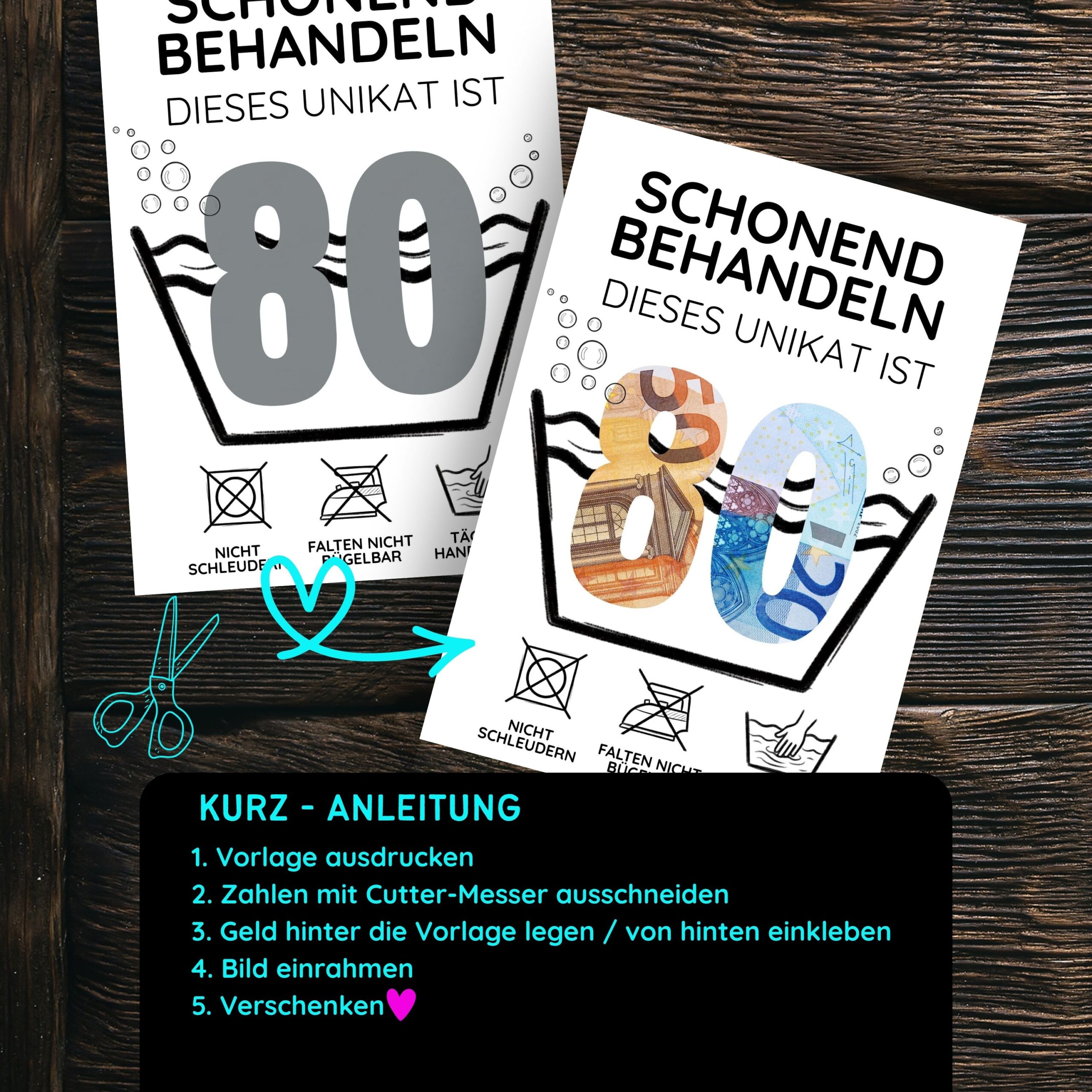 Du möchtest zum 80. Geburtstag Geld verschenken und mehr als nur eine langweilige Karte an das Geburtstagskind übergeben? Dann kommt meine Idee: Die Druckvorlage "Schonend behandeln - das Unikat ist 80!" ist genau das Richtige! Einfach ausdrucken, mit einem Cutter die vorgezeichneten Zahlen ausschneiden - Geldscheine dahinter legen und z.B. in einem schönen Rahmen dekorieren. Fertig ist dein DIY-Geldgeschenk!