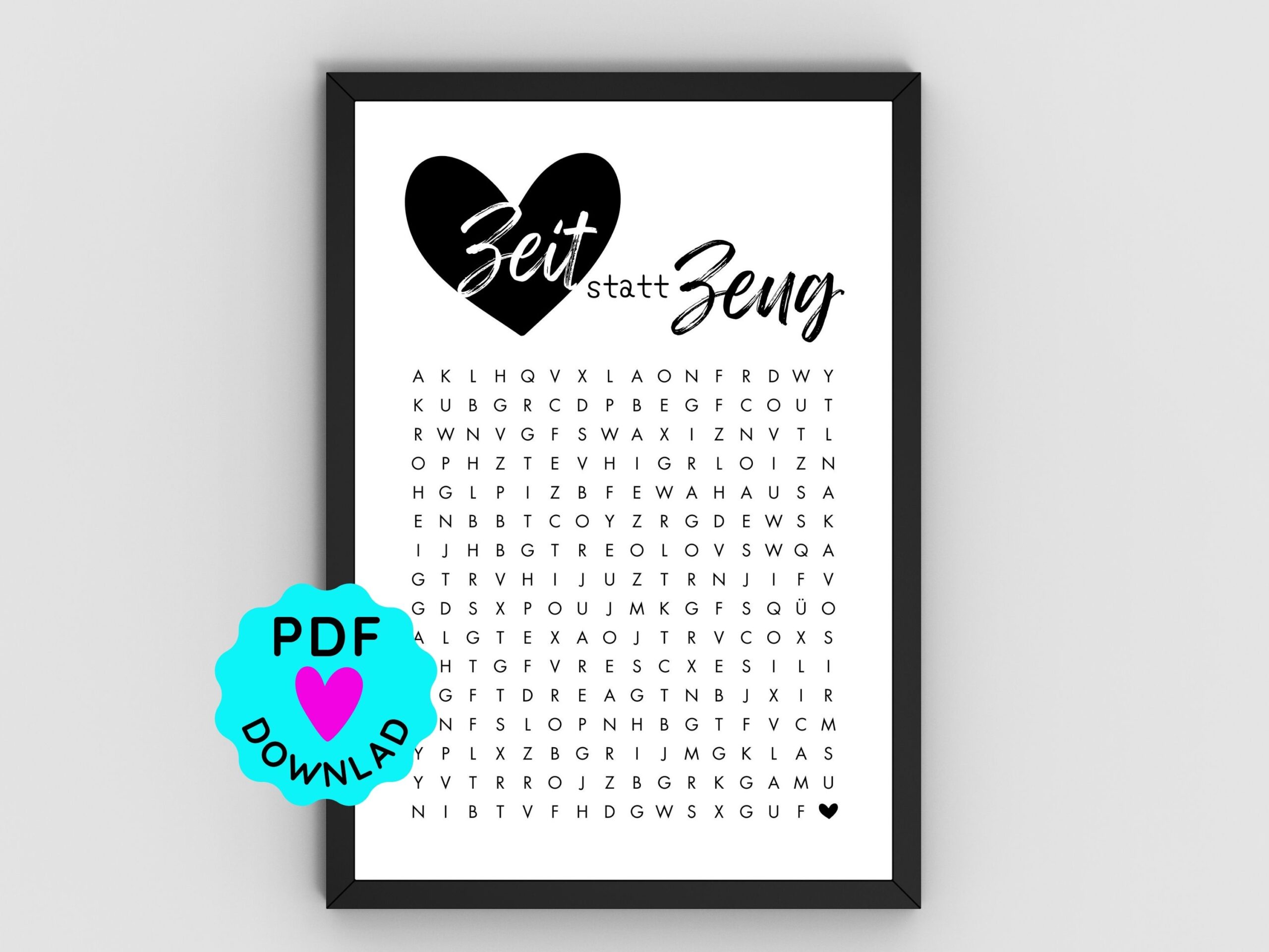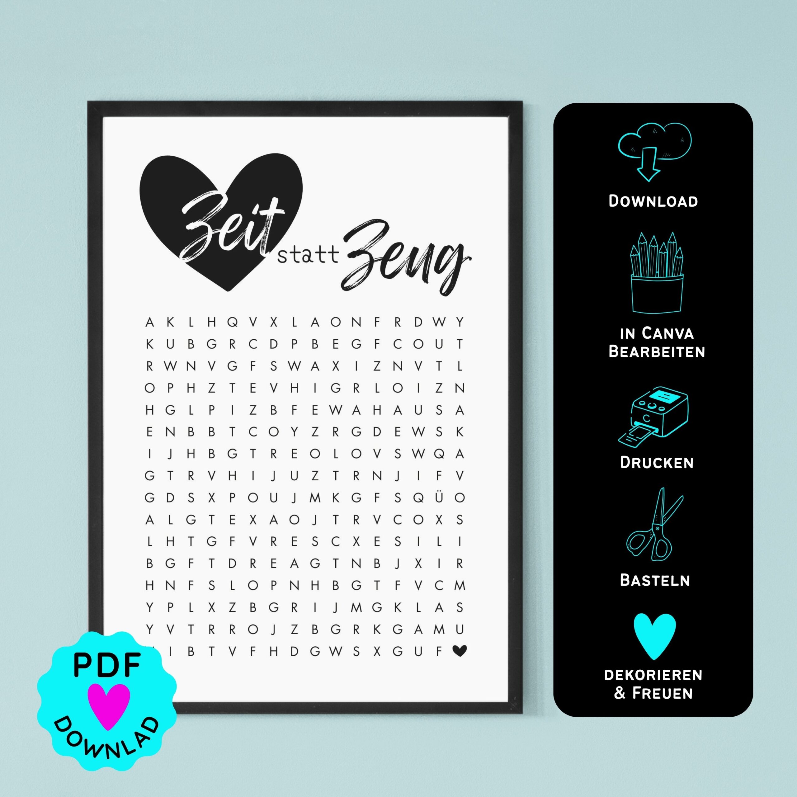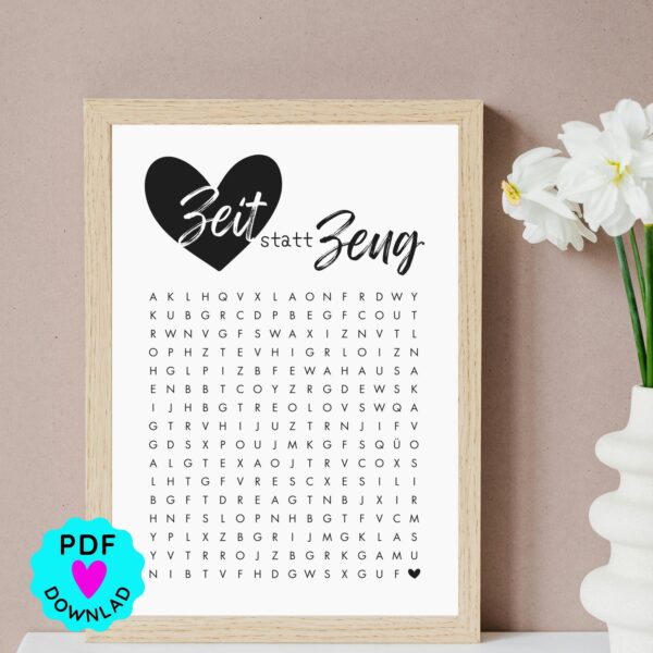 Nach dem Kauf erhältst du eine PDF mit einem Download-Link direkt zu Canva. Mit einem gratis Account kannst du ganz einfach die Vorlage bearbeiten. Verstecke eine kleine Nachricht, eine Botschaft oder eine Einladung im Suchsel. Danach einfach ausdrucken & verschenken.